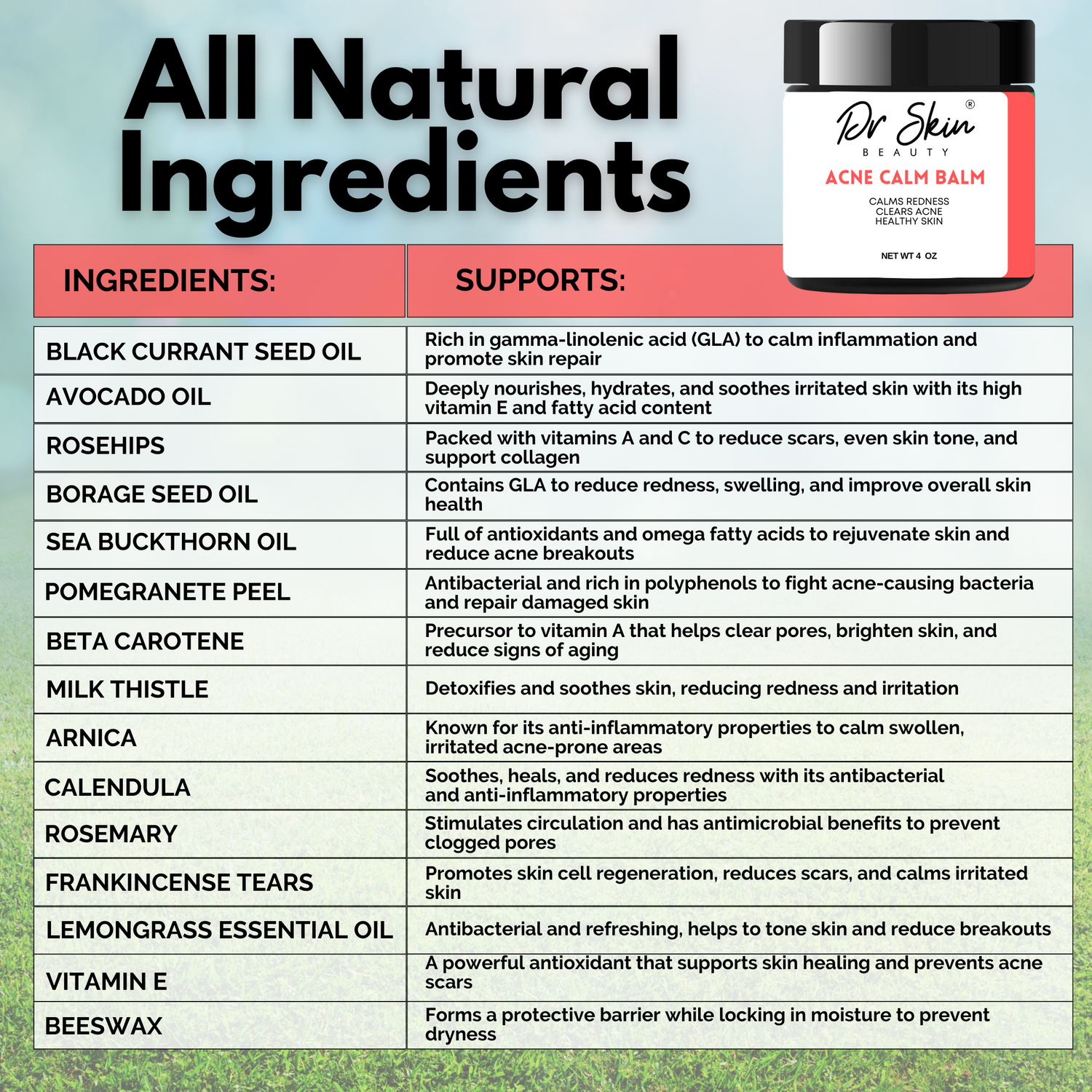 Acne Calm Balm: Black Currant Seed Oil, Avocado Oil, Rosehips, Freeze Dried Potato, Borage Extract, Sea Buckthorn Extract, Pomegranate Peel, Beta Carotene, Milk Thistle, Arnica, Rosemary, Frankincense, Calendula, Pomegranate Seed Oil, Borage Seed Oil, Sea Buckthorn Oil, Beeswax, Lemongrass Essential Oil.