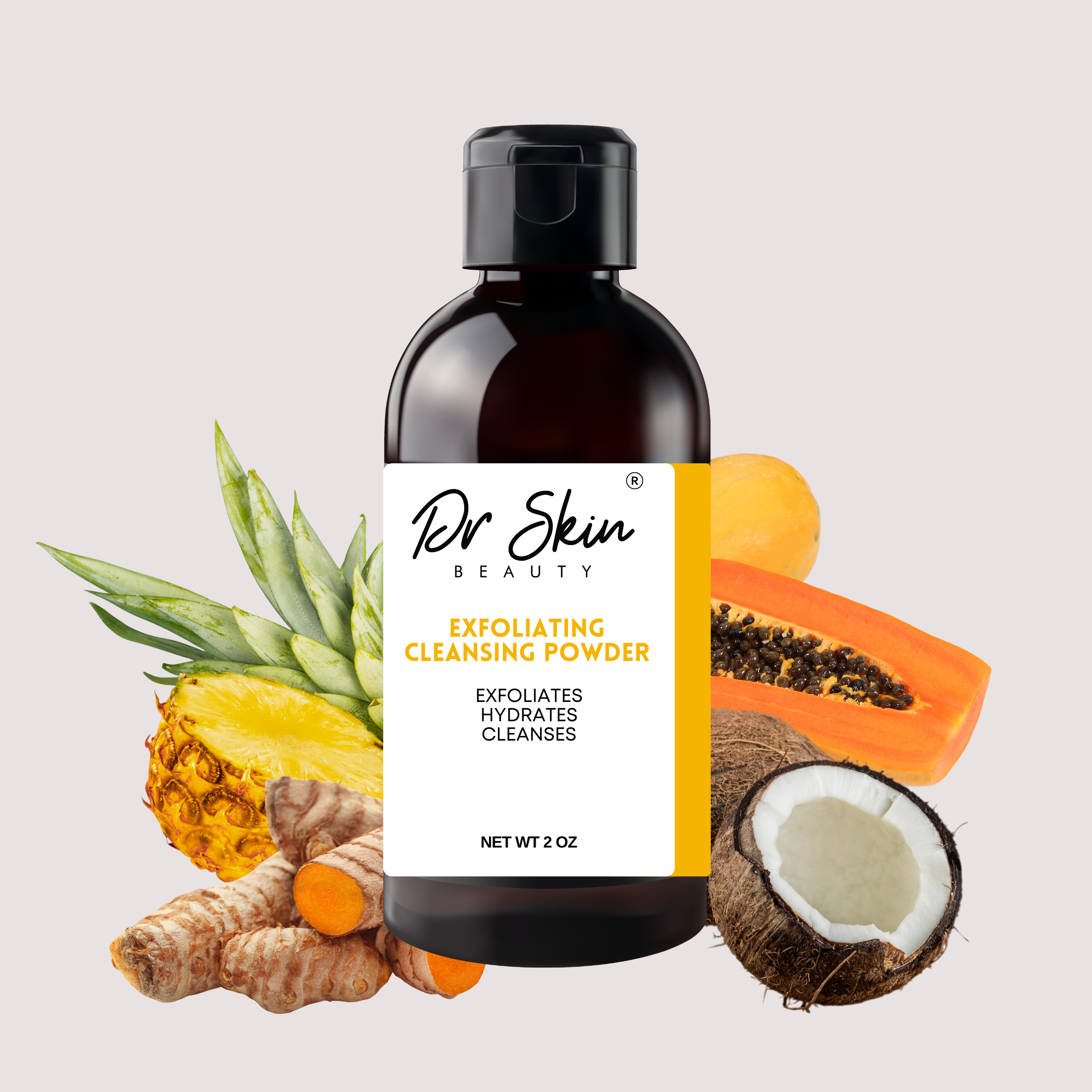 Exfoliating Cleansing Powder: Jojoba beads, Adzuki Beans, Maize Powder, Rose Petals, Papaya, Coconut Milk, Rice Powder, White turmeric, Aloe, Pineapple, Marigold, Lemon, Maltodextrin, Sodium Lauryl, Glycerin, Sodium Coco Sulfate, Microcystalline Cellulose, Guar Gum.